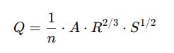 Où Q est le débit (m³/s), n est le coefficient de rugosité du tuyau, AAA est l’aire de la section transversale du tuyau (m²), RRR est le rayon hydraulique (m), et SSS est la pente du tuyau (m/m). Cette formule permet de dimensionner les tuyaux de manière à obtenir un écoulement optimal.